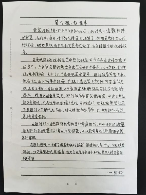 4月3日,我校安排学生利用清明假期回家完成“祭祖·记祖”寻根感恩作业,要求学生回家祭祖时要文明祭扫,并在手机中保存祖坟的经纬度。同时,回家翻看族谱,记住上五代祖先的姓名,再请父母或长辈讲述一个祖先的故事,并用文字记录下来。
