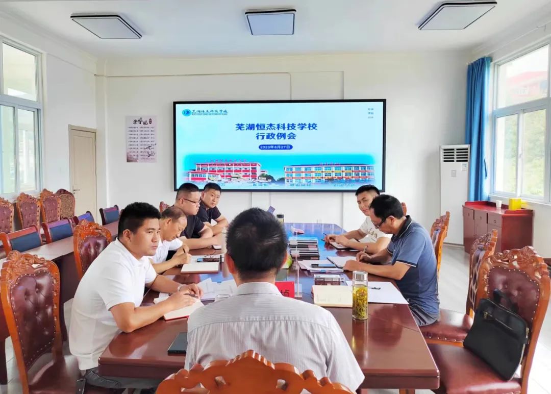 芜湖恒杰科技学校于8月27日上午召开秋季开学行政例会,校长李干桢现场办公,各职能部门领导参与。会上,各部门就新学期工作重点、保障措施及开学筹备情况作了详细汇报,李校长逐一进行点评,并提出了具体的修改意见和建议。